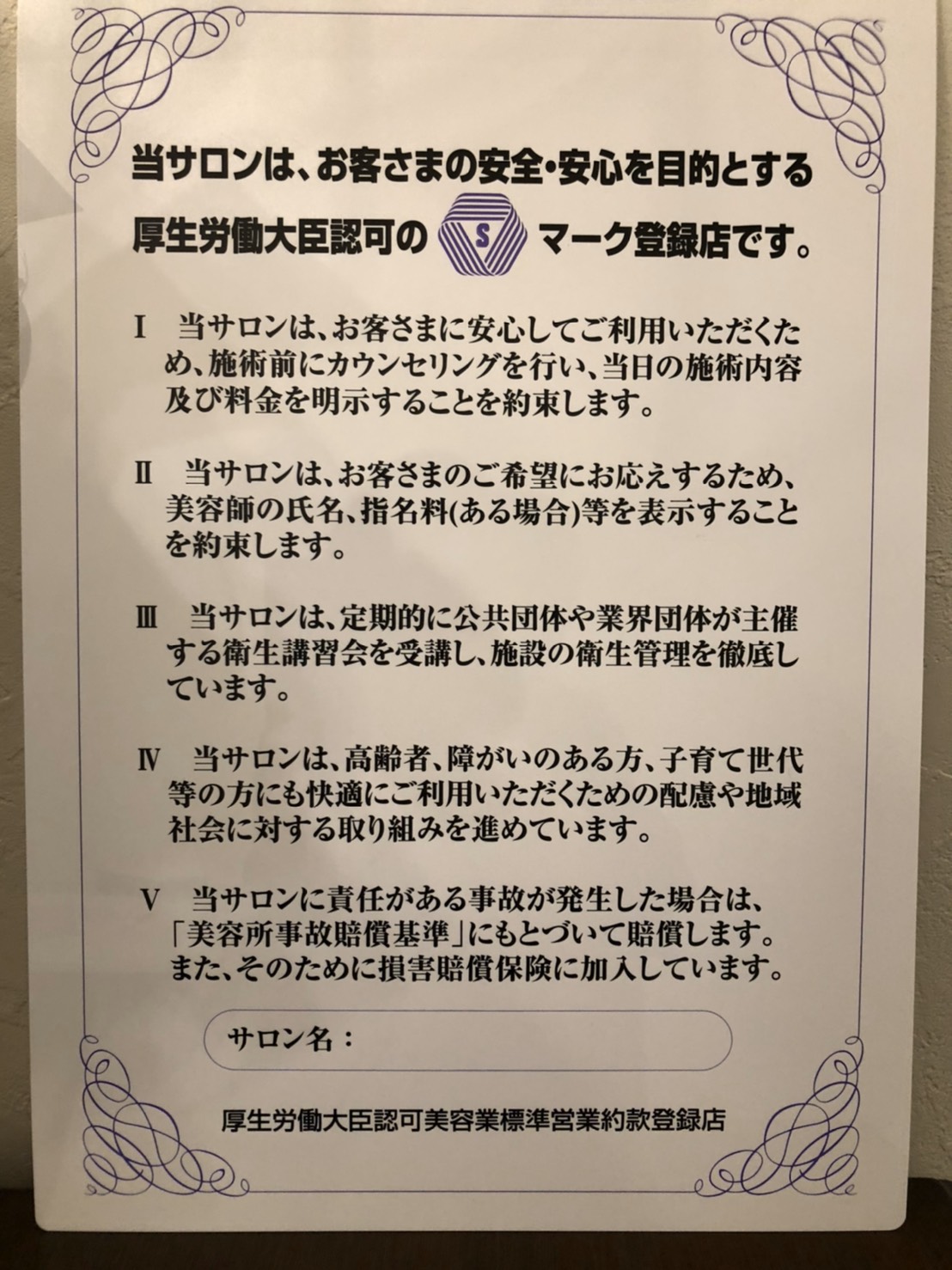 当店は衛生面などの厳しい基準に合格した厚生労働省認定”Sマーク”取得店です。