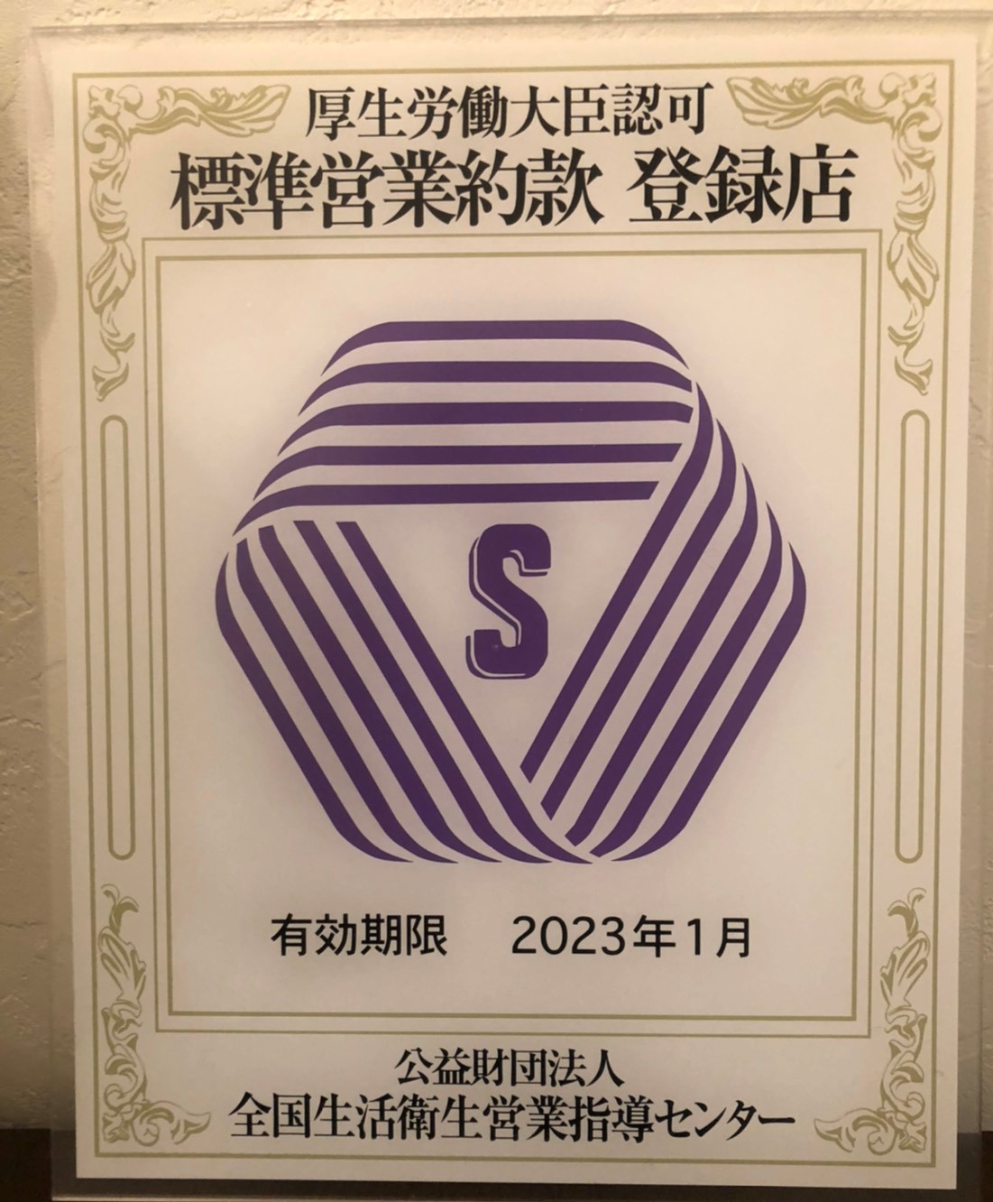 当店は衛生面などの厳しい基準に合格した厚生労働省認定”Sマーク”取得店です。